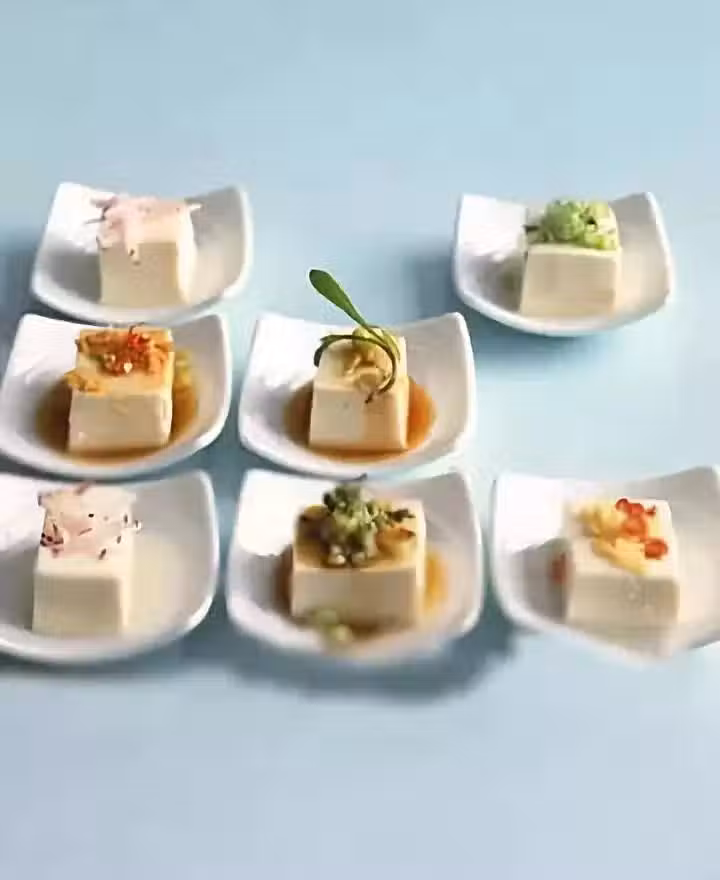2塊豆腐,3匙醬油,1匙鮮薑汁,1/2匙芥末粉,香菜,紅辣椒,黃瓜,姜,海苔,豌豆苗,蘿蔔,芝麻,荷蘭豆,芥末醬。