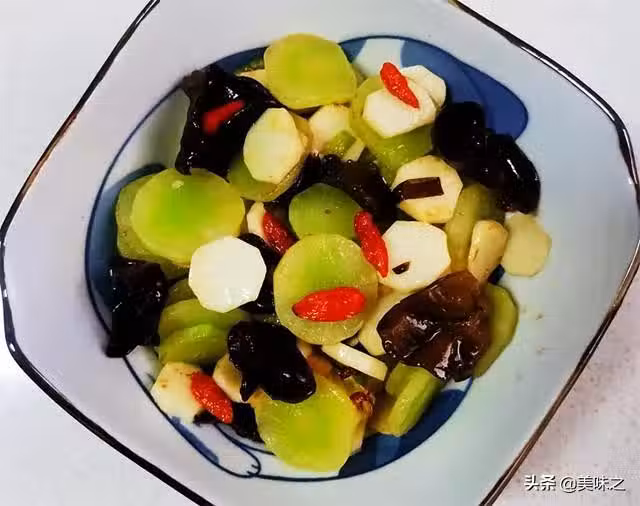 萵筍一個、木耳20g、山藥1/4根、小蔥一顆、大蒜一粒、枸杞15顆、花椒粒16顆、鹽適量、芝麻油少許、花生油少許、香醋適量。