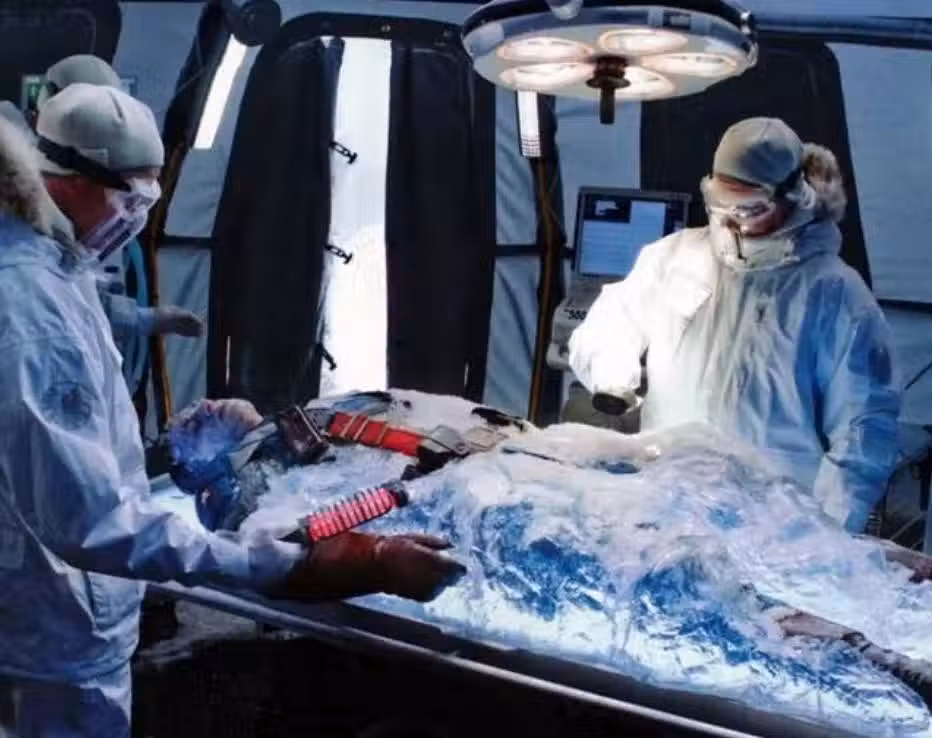 上午九點半,幾個科研人員屏息斂聲,將裝著貝德福德遺體的冷凍罐用研磨砂輪機小心翼翼地割開, 然後看到了50年前這位首位冷凍人,他像睡著了一樣靜靜地躺在擔架上。