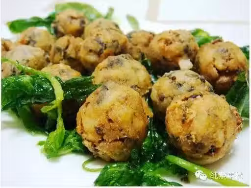 4、放入油鍋,用中火炸至金黃色,撈出。另外小菠菜洗凈後放入油鍋中略炸即刻撈出,鋪在碟子上,將炸好的蔬菜球放在菠菜上即可。