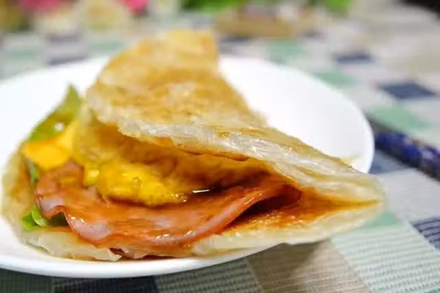 最後將洗凈的生菜、火腿片、雞蛋、芝士依次放入煎好的手抓餅上,塗上一次甜麵醬(醬料看自己喜歡,也可以加一些辣醬的),將手抓餅對摺後即可食用