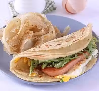 火腿午餐肉一片(用培根、火腿腸、圓火腿片、滷肉醬牛肉都可以);笨雞蛋一個(也叫柴雞蛋、本地雞蛋、散養雞蛋);手抓餅一張烙好;蔥花少許;辣醬適量(我們這裡都用蒜蓉辣醬,當然可以用自己喜歡的任何醬料);青菜適量;