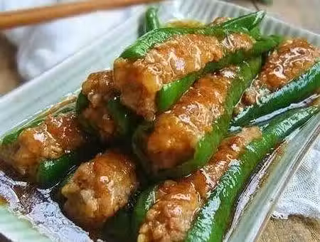 2、青辣椒洗凈,去凈內部的籽(在一邊劃一刀就可以很方便去除辣椒籽)把辣椒里填滿肉餡,依次釀好。