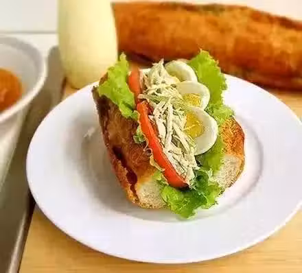 ●法式麵包切成12厘米左右的長段,再從中間切一刀,不必完全切斷,開口內抹上一層黃油,將西紅柿片、生菜葉、拌好的雞肉絲、雞蛋片一起夾在麵包內就好了。