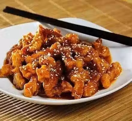 用料:豬裡脊250g;料酒1茶勺;鹽適量;麵粉1湯勺;玉米澱粉1茶勺;泡打粉1茶勺;蕃茄沙司100g;白砂糖50g;蜂蜜50g;白醋50g;水澱粉4茶勺;芝麻適量