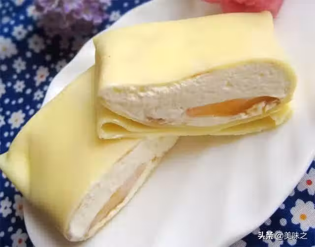 9、在班戟皮上放入適量奶油,再放上幾塊芒果,再加入少許奶油。