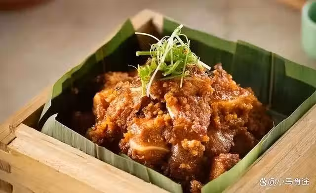 2.將豬軟骨切成長約3厘米的方塊,衝去血水,加入梅乾菜碎、豆瓣醬、醬油、海鮮醬、蚝油、白糖、味精、紅油拌勻,加入混合米拌勻,放入蒸籠蒸2小時,即可出鍋,點綴蔥絲即可。