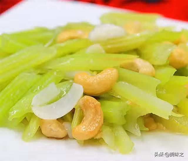 西芹250克、腰果50克、百合15克、鹽1小勺、玉米澱粉10克、雞精1克、蔥5克、蒜3克。
