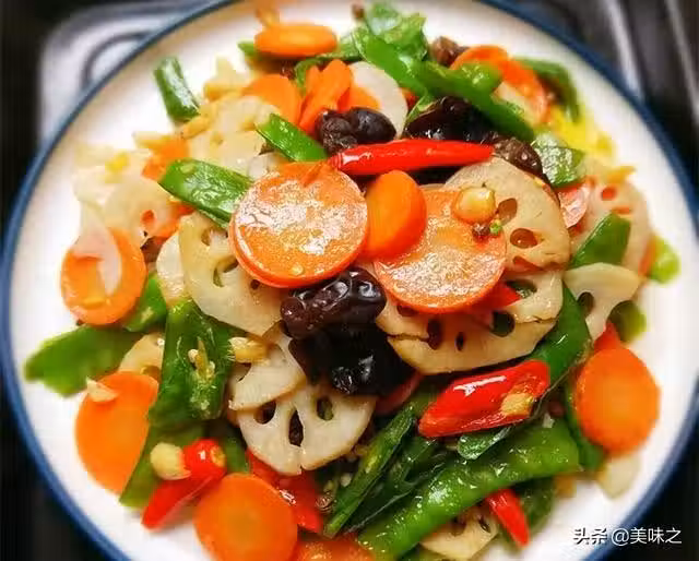 蓮藕1段、胡蘿蔔1個、木耳1小把、荷蘭豆適量、姜1塊、蒜2顆、青辣椒3個、紅辣椒1個、鹽1勺、生抽1勺、食用油適量、雞精1小勺。