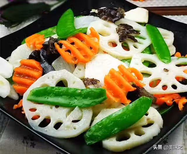 蓮藕100克、山藥50克、荷蘭豆50克、胡蘿蔔50克、水發木耳50克、鹽2克、雞精2克、香油適量、蔥適量、姜適量。