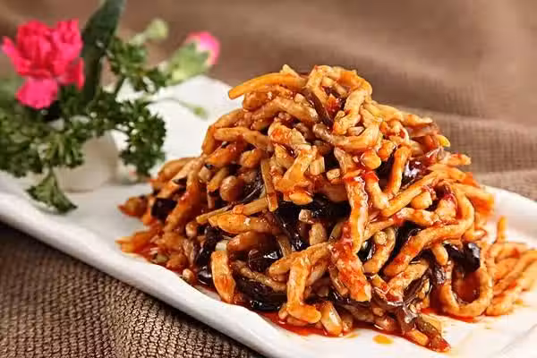 用料:豬裡脊肉300克、冬筍80克、黑木耳3朵、雞蛋清1個、食鹽3克、醬油15克、姜2片、蒜6瓣、料酒10克、米醋20克、澱粉15克、小蔥2棵、泡紅椒10克、白糖25克、植物油50克
