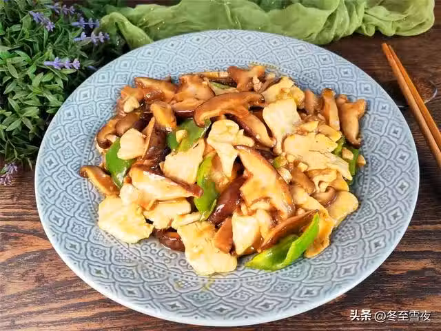 【香菇雞肉片】所需材料:鮮香菇300克、雞胸肉1塊、尖椒1個、油鹽適量、香油1湯匙、蔥1段、姜2片、大蒜2瓣、生抽1湯匙、蚝油1湯匙、水澱粉適量、