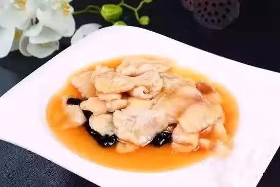 3、泡發的木耳50克汆水,入盤墊底。鍋下香糟酒100克、毛湯80克、白糖25克、薑汁、鹽各少許燒開,放入魚片稍微煨一下,勾芡,淋明油出鍋裝盤即可。