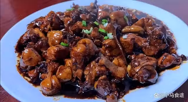3.起鍋燒油,加入少許豬油更香濃,下入雞肉塊煸炒出多餘水汽,下入蔥段、薑片、幾個八角、桂皮、香葉、草果、小茴,煸炒出料香,烹入料酒去腥,下入適量調稀的甜麵醬、老抽、生抽,炒出醬香,添入適量鮮湯或者開水沒過食材,下入香菇,大火燒開,調入鹽、五香粉或者十三香、雞精、蚝油,轉中小火燉20分鐘,再挑揀出料渣,再轉大火燒至濃稠,燒至入味,淋入少許花椒油翻拌均勻,撒入蔥花,即可出鍋裝盤。