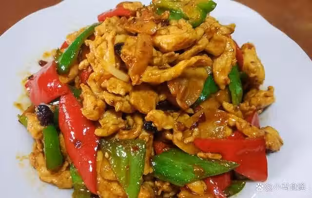 2.起鍋燒油,下入等量的老乾媽豆豉醬、甜麵醬、剁細的豆瓣醬,蔥姜蒜片,炒出醬香,下入辣椒和雞肉,翻炒均勻,青椒斷生,即可出鍋裝盤,美味即成。