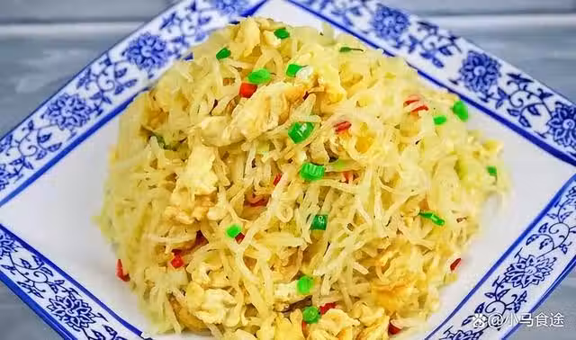 1.土豆去皮洗凈,改刀切成均勻的細絲,焯水斷生,沖涼備用。