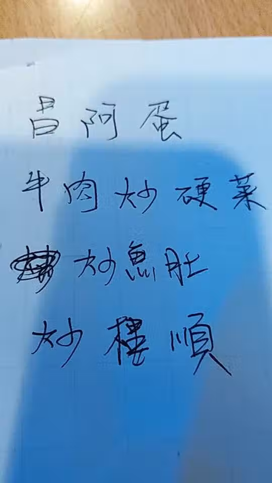 全家要一起點外賣時,有時候會找來一張紙條,把大家想吃的餐點和口味通通寫下來,方便打電話訂餐的人照著念。一戶人家準備點熱炒外帶,老公隨手拿起紙筆寫下想吃的菜色:「昌阿蛋、牛肉炒硬菜、炒魚肚、炒樓順」。不過如果你是店員的話,這4道菜你看得懂幾道呢?