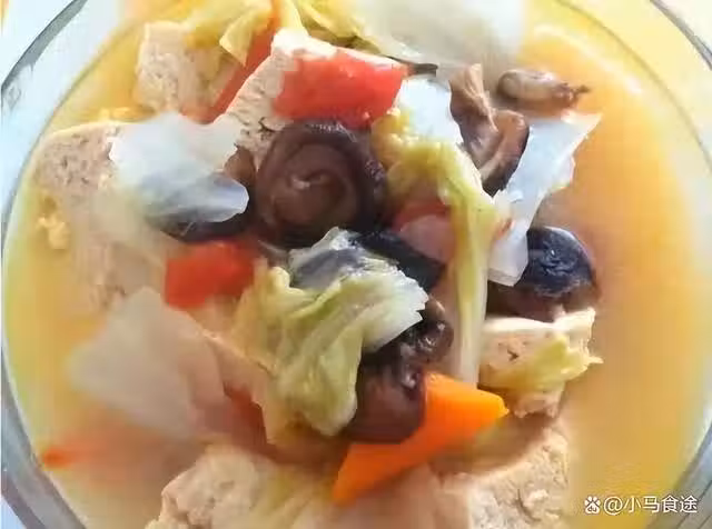 2.起鍋燒油,下入香菇和胡蘿蔔炒香,再放入西紅柿,調入鹽,炒至西紅柿化成汁,倒入砂鍋中,放入凍豆腐塊,加水沒過所有的菜,烹一點生抽,小火燉上十幾分鐘,放入撕成小塊的娃娃菜再煮兩分鐘,調入胡椒粉、香油,出鍋裝盤即可。
