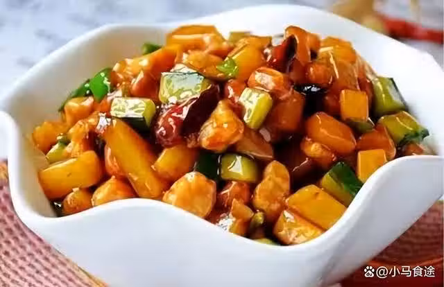 6.接著炒鍋里放入土豆丁翻炒,加入調好的料汁,大火煮至3分鐘,加入黃瓜丁和青椒丁翻炒翻炒,再倒入肉丁繼續翻炒,加入花生米,淋入水澱粉收汁,淋入少許香油,炒均出鍋裝盤即可。