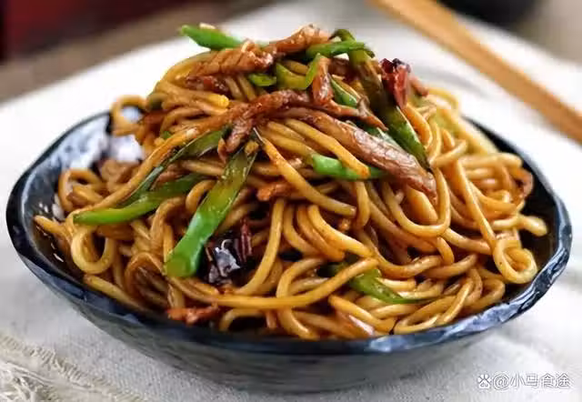 1.起鍋燒油,加入化豬油,下入蔥姜蒜、干辣椒爆香,下入肉絲炒斷生,烹入料酒、調入醬油、鹽、十三香、胡椒粉、味精和雞精,翻炒入味,下入青椒炒出辣香,下入過水的熟麵條,快速翻炒均勻,鍋邊烹入香醋,淋入明油,炒勻出鍋裝盤,美味即成。