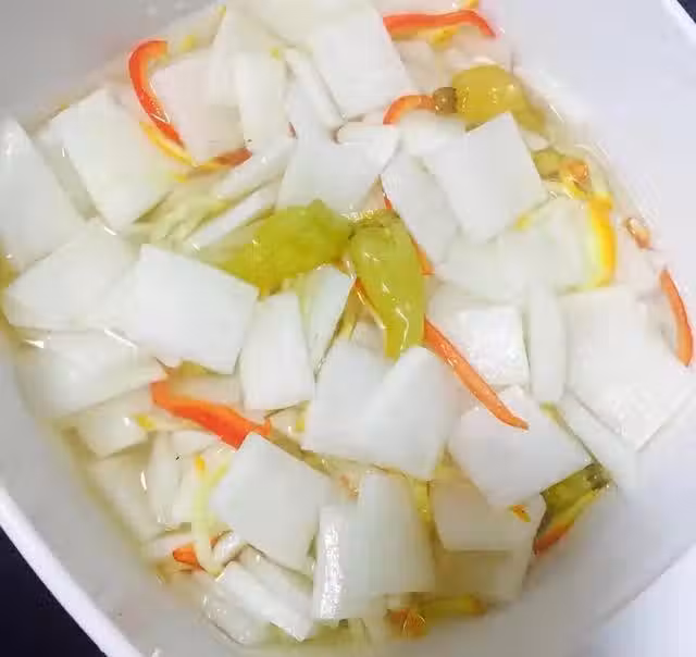 1.白蘿蔔處理乾淨,改刀切片,納入盆中。倒入一包野山椒,野山椒可以用剪刀剪開,這樣更入味,再加入多一些的白醋或者米醋,適量冰糖或者白糖,適量鹽和雞精,可以切點其他食材配色,最後加入適量涼白開稍微沒過食材,放入冰箱冷藏幾天,隨吃隨取,這款泡菜不能久置,最多吃五天,再重新做。