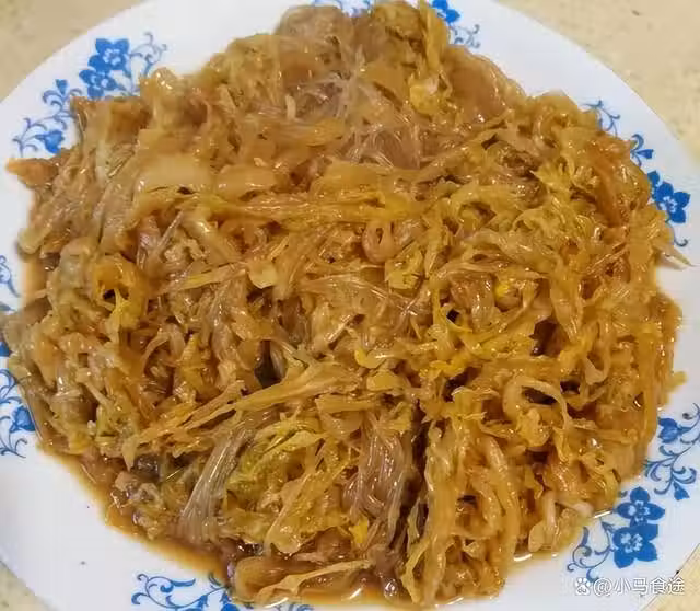 1.東北酸菜用清水泡一泡,再拽干水分,改刀切成均勻的細絲備用。粉條用清水泡發,洗凈,改刀成均勻的長段,納入盆中,加點醬油調一下色。