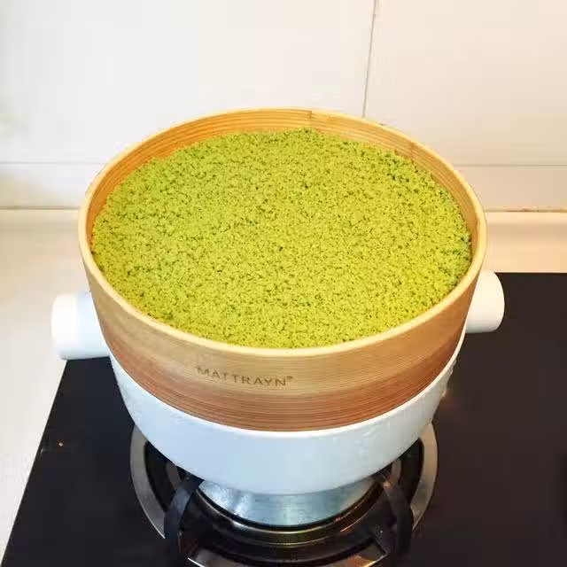 倒入墊了紗布的蒸籠中,整平開蒸上氣後計時半小時左右,全程大火,涼後取出切件。