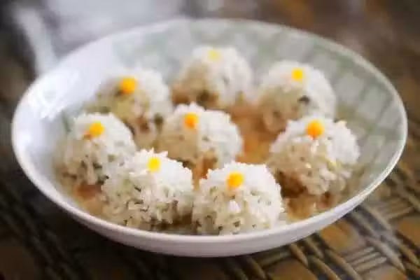 原料:絞肉150克、板豆腐一塊、長糯米適量、胡椒粉、薑末、香油1茶匙、雞蛋清一個、鹽適量。