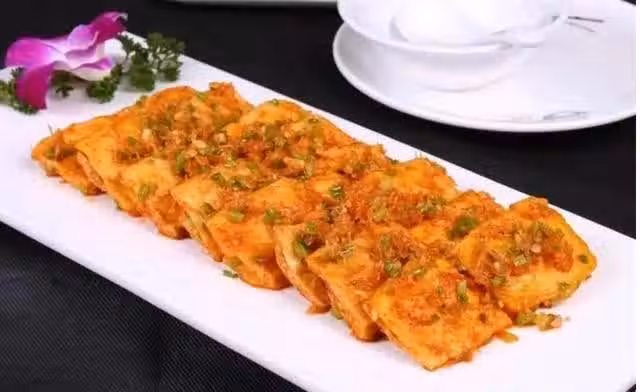 1.老豆腐上鍋蒸一下,切的時候不容易散架,直接改刀切約1厘米厚的片。