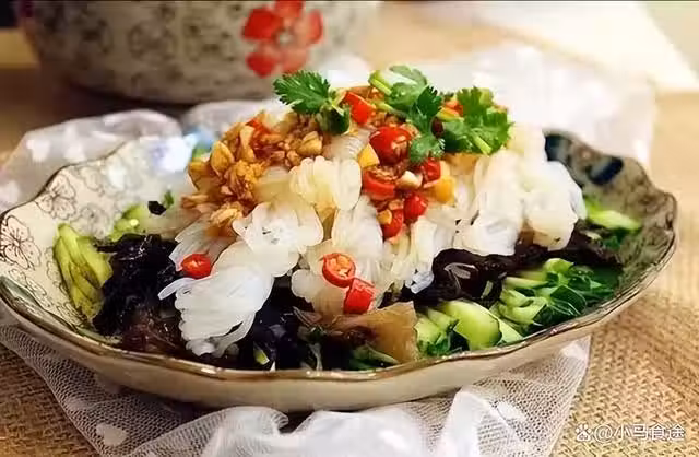 4.將木耳絲放到盤中黃瓜絲的上面。