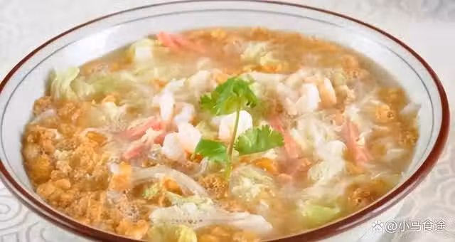 4.再起鍋燒油,下入蝦仁炒香,加點麵粉炒出面香,下入白菜炒一炒,倒入適量開水沒過食材,下入煎過的雞蛋,大火熬至湯色奶白,調入鹽、胡椒粉,攪一攪,即可盛出食用。