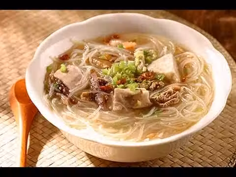 4、 取一事先准備的碗,將作法1的米粉放入碗中,再把作法3淋於米粉上,食用時加入調味料B及油蔥酥即可。
