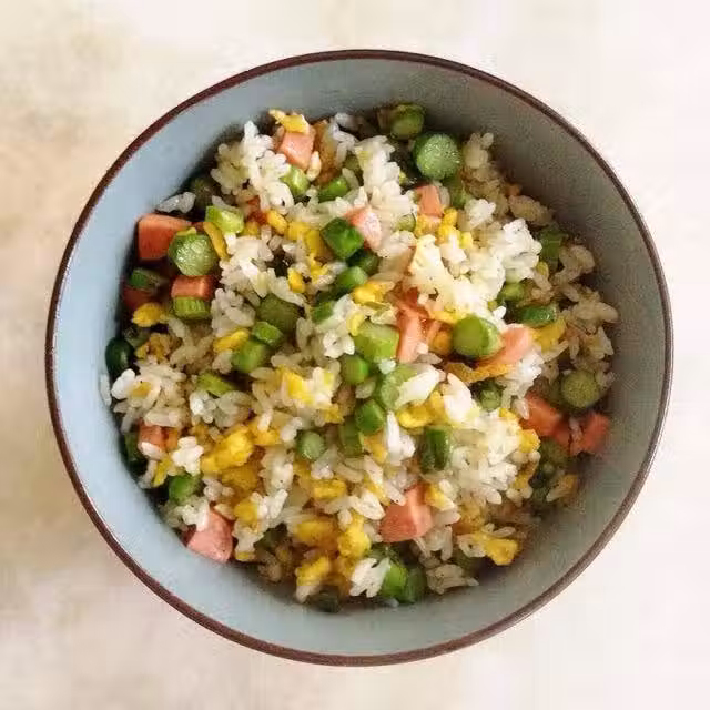 蘆筍;雞蛋1個;火腿腸半根;鹽;黑胡椒粉;米飯;小尖椒2個;蒜1瓣