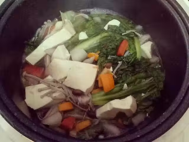 把豆湯裡加上淘米水,把紅白蘿卜,金針菇一起放進去煮。最後再加比較容易熟的青菜和豆腐。加鹽。