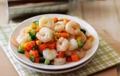 用料:蝦仁350g;黃瓜30g;胡蘿卜30g;玉米粒30g;油1大勺;鹽1小勺;白酒1小勺;澱粉2小勺