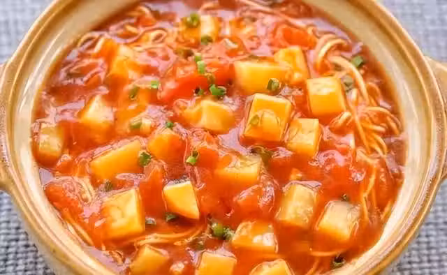 番茄土豆面,西紅柿去皮切丁,土豆去皮切丁,起鍋燒油,下入蔥薑末爆香,下入西紅柿炒出汁,下入土豆丁炒均勻,調入鹽、胡椒粉、醬油、味精、少許白糖,香油翻炒均勻,撒入蔥花,土豆斷生即可出鍋,澆在煮熟的細掛麵中,不僅做法簡單,而且好吃極了。