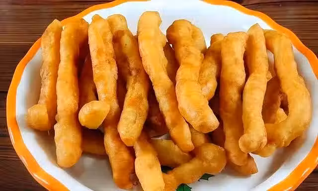 棍棍小油條,同樣同上面的發麵團,擀成厚片,切粗條,再搓成條,下入六成熱的油鍋中,炸至蓬鬆金黃即可撈出控油,裝盤食用。