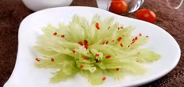 1.西芹摘洗乾淨,抽掉老筋,改刀切鳳尾,放入冰水中浸泡片刻,撈出控水裝盤,撒上紅椒粒點綴。