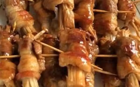 3、用五花肉捲住適量金針菇,用牙籤固定好