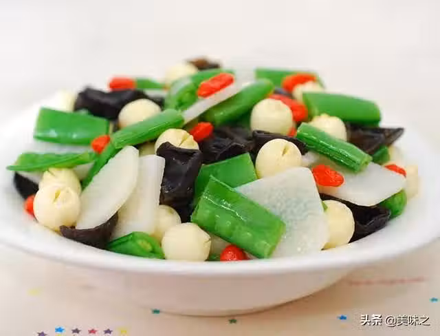 甜豆適量、山藥適量、木耳適量、蓮子適量、枸杞適量、鹽適量、雞精適量、花椒油適量。