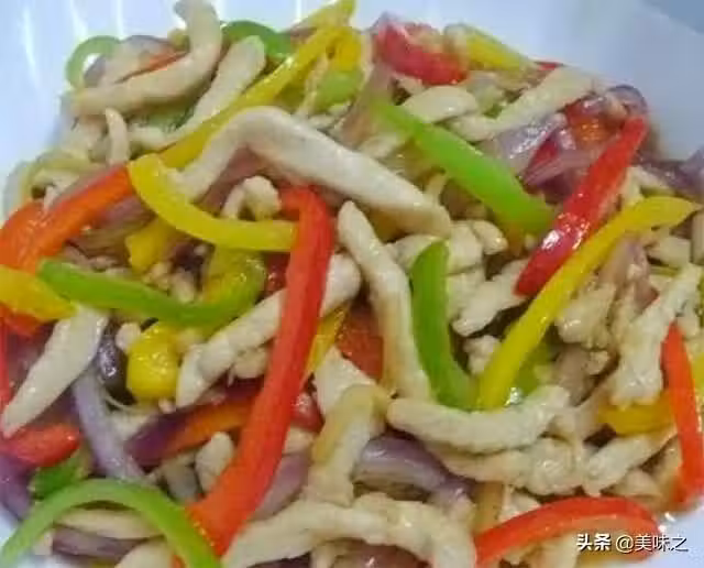 內雞胸肉200克、青椒80克、紅椒100克、黃椒100克、蔥頭80克、生抽半勺、鮑汁一勺、糖半調味勺、鹽少許。