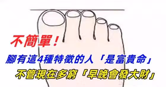 每個人有每個人的特徵。每個人的腳也有著不同的特徵,正所謂手有手相,腳有腳相。命里財多還是財少,有時通過腳相就可知曉。今天小編就跟大家來分享下,腳有哪四種特徵的人不管現在多窮,早晚都會發大財?