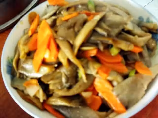 3、鍋內熱油放入蒜爆香放入胡蘿蔔蔥花翻炒幾下把蘑菇倒里翻炒加鹽雞精一點點醬油關火放入點香油