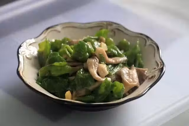 1、平菇撕成寬條,洗凈焯水,略擠掉多餘的水分。青椒洗凈去籽,用手掰成小塊