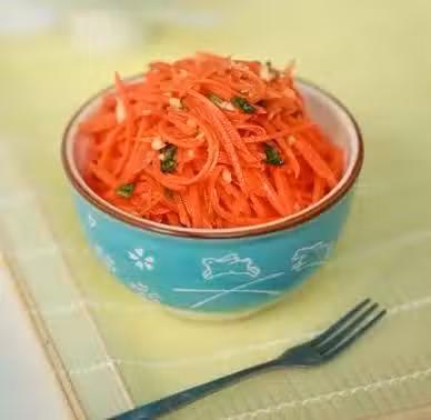 胡蘿蔔1根;香菜若干;大蒜末若干;鹽1克;白醋10克;橄欖油20克;雞精1克