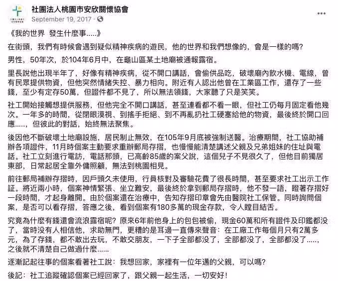原來6年前,他因為包包被偷,現金60萬和所有證件都不見了,從此身無分文,不能接受,才會突然什麼都不記得。如今他好不容易終於碰到好心人,想起來後也激動地說:「我想回家,家裡還有爸爸,可以嗎?」這段故事讓不少網友感動地說:「人生空白了多久,才遇到好人!」、「謝謝社工沒有放棄他,相信他的話。」而男子目前已經送回東部住處,和家人團圓了。