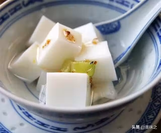 9、將杏仁豆腐切小塊倒入糖水內,澆糖桂花、撒上果丁即可食用。