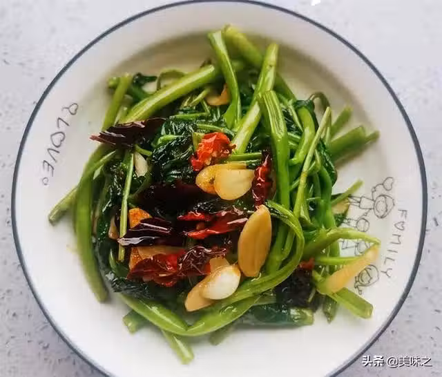 6、一盤香辣可口的熗炒空心菜就做好了。