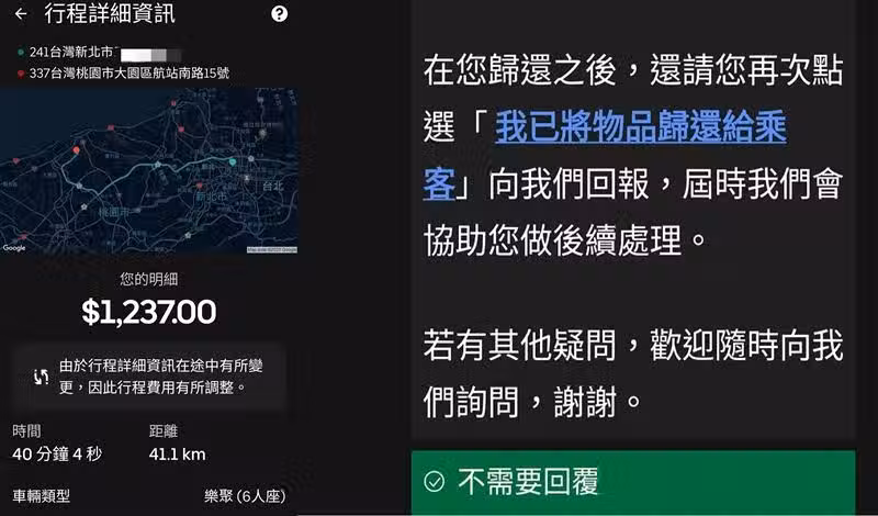 司機一路從新北市趕回桃園機場,花了40分鐘將親人遺物送還給外國旅客,對方也豪邁給出3,000港幣的高額小費,答謝司機的體貼。司機直接在機場換匯,實收新台幣1萬1千136元。本來歸還客人遺落物應收1,237元車資,不過司機不打算收取並送上祝福:「您回贈的實在讓我太驚訝了,Uber方面就不再回報索取車馬費了,祝您一生平安順遂。」