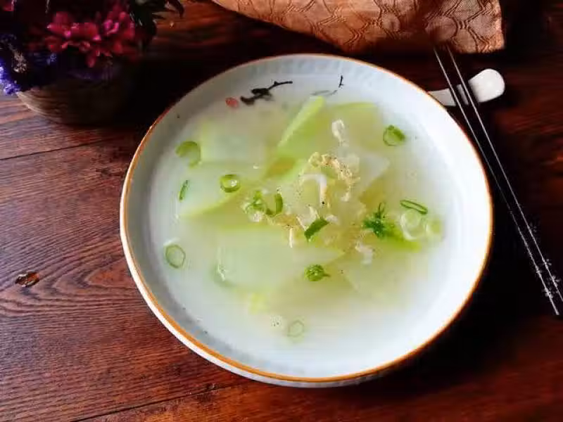 材料:冬瓜500克、蝦皮1湯匙、香油1湯匙、鹽適量、蔥1段、姜2片、白鬍椒粉1/2茶匙、